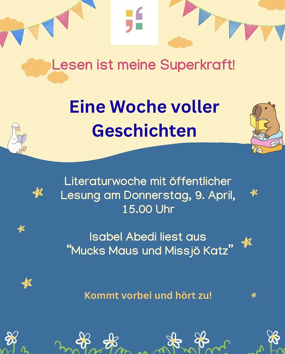 Isabel Abedi liest am Donnerstag, 09.04.26, um 15 Uhr aus ihrem Buch „ Mucks Maus und Missjö Katz“ vor. Dazu laden wir alle Interessierten herzlich in unsere Schule ein.