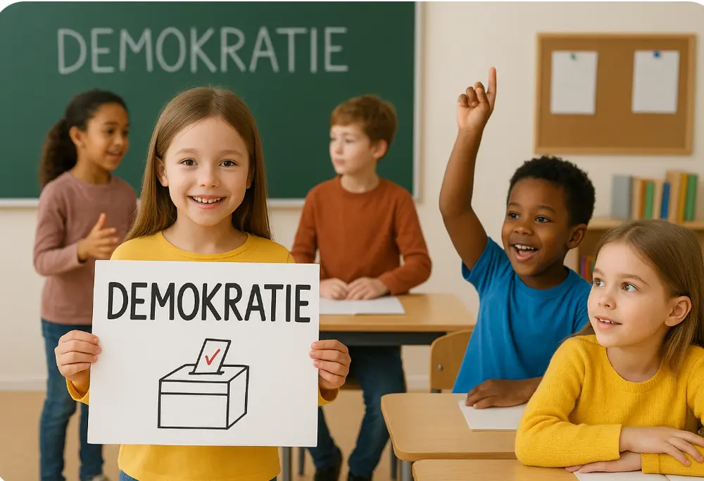 Demokratie bedeutet, dass alle mitbestimmen können, so unterschiedlich wir auch sind. Es ist wichtig, die Meinung anderer zu hören und gemeinsam Entscheidungen zu treffen.