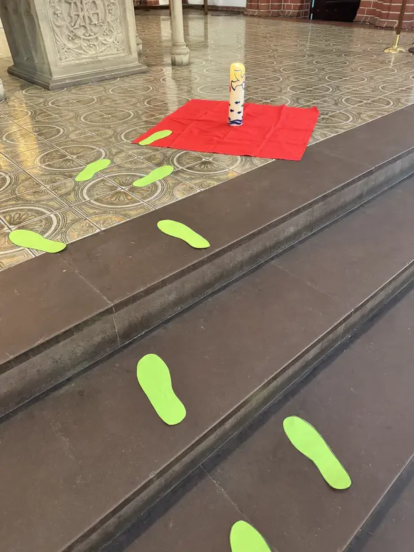 Unser Schuljahresanfangsgottesdienst hat uns daran erinnert, wie wertvoll dieser Neubeginn ist. Das Lied „Aufstehen, aufeinander zugehen“ begleitete uns dabei und machte deutlich: Wir dürfen nicht warten, bis sich etwas verändert – wir selbst können den ersten Schritt tun. Indem wir aufeinander zugehen, können wir ein friedliches Miteinander gestalten und unsere Schule zu einem Ort machen, an dem sich alle wohlfühlen. Symbolisch haben dies die Kinder der Klasse 4b getan, indem sie während des Gottesdienstes Schritte zur Friedenskerze gelegt haben.